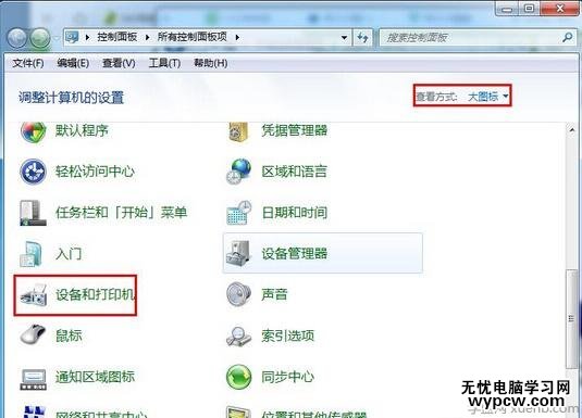 2、進入控制面板頁面后,我們將右上方的查看方式設置為“大圖標”,然后找到并點擊“設備和打印機”,如下圖所示: