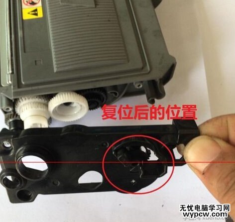 7、把半圓形里的小塑料片向左邊撥動,然后再上回粉盒去,擰緊三棵螺絲,清零操作完成。