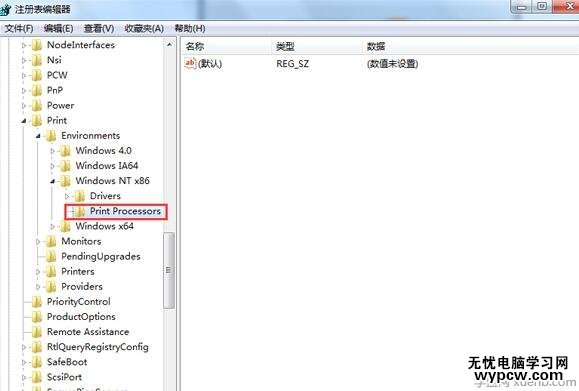 3、依次展開“HKEY_LOCAL_macHINE/SYSTEM/CurrentControlSet/Control/Print /Environments/Windows NT x86/Print Processors”,查看“Print Processors”項下有沒有“winprint”項,若沒有,在右邊空白處單擊右鍵,新建一個項,改名為“winprint”;
