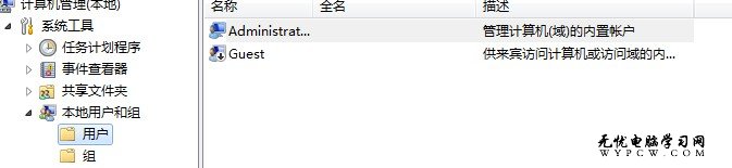3、系統中默認為兩個賬戶,一個是管理員Administrator,一個是來賓賬戶:Guest。鼠標點擊選中一個賬戶,然后單擊右鍵,就可以進行修改密碼或設置屬性等操作!系統密碼的設置一般不少于7位,這樣安全才能達到!