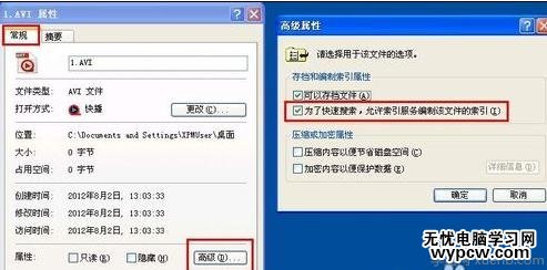 解決方法:右擊AVI視頻文件,打開的右鍵菜單單擊“屬性”命令,進(jìn)入屬性界面,在“常規(guī)”選項(xiàng)卡下單擊“高級”按鈕,在打開的“高級屬性”界面去掉“為了快速搜索,允許索引服務(wù)編制該文件夾的索引”復(fù)選框,單擊“確定”按鈕