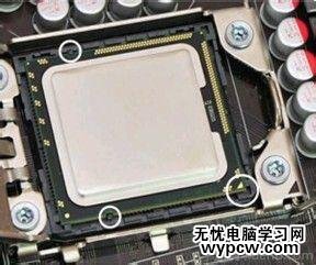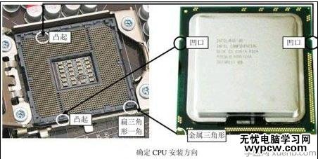 步驟3:仔細觀察CPU正而,會發(fā)現(xiàn)某個角有一個金屬三角形符號,同時在主板插座上有個角呈扃三角形狀(或同樣有個金屬三角形符號k安裝時,將CPU有金屬三角形的那個角對準插座上呈扁三角形的那個角,就能確定CPU安裝方向(這種方法適用于所有品牌和規(guī)格CPU的安裝)。此外,在IntelLGA775、LGA1366,LGA1156架構的CPU上有兩個凹口,而插座上會有兩個凸起,安裝時,將兩個凹口和凸起對準,這樣也可按正確方向安裝CPU,如圖3所示。