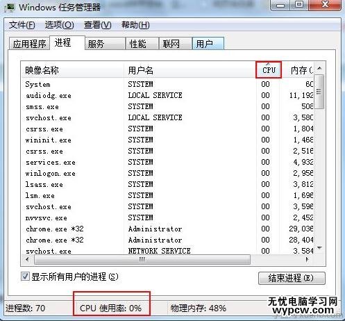 首先我們打開任務(wù)管理器,然后切換到cpu行列,對占用cpu的出程序逐一排查,查看哪個cpu程序占用的cpu忽高忽低的情況。找到占用cpu不穩(wěn)定的進程將其結(jié)束掉(不是系統(tǒng)進程的前提下),如果發(fā)現(xiàn)時系統(tǒng)進程不能結(jié)束的話,那就系統(tǒng)的問題了。