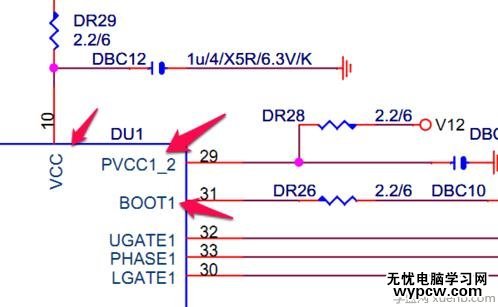 根據(jù)CPU電源管理芯片的引腳定義測(cè)量芯片上的VCC,PVCC,BOOT腳的電壓是否為12V,12V,5V,若有,為正常,若無(wú),測(cè)需要檢測(cè)與之相連的元件,供電腳上的限流電阻,電容和二極管是否正常.