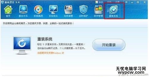 1、首先下載金山衛(wèi)士,打開衛(wèi)士主界面中“重裝系統(tǒng)”標(biāo)簽。