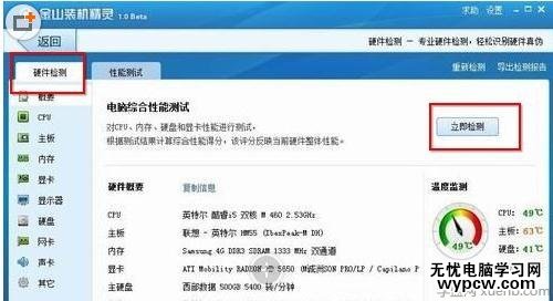 2、然后切換到“硬件檢測(cè)”功能,自動(dòng)幫你檢測(cè)當(dāng)前計(jì)算機(jī)的硬件設(shè)備詳細(xì)信息以及當(dāng)前主板當(dāng)前溫度是多少,當(dāng)你的主板溫度達(dá)到危險(xiǎn)值,溫度數(shù)字顏色會(huì)變得越來(lái)越紅。