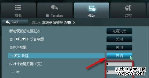 在高級選項中,可以點(diǎn)擊”高級電源管理(APM)“選項,設(shè)置電腦的定時開機(jī)功能。進(jìn)入后,開啟由RTC喚醒(此項為南橋模塊喚醒,只要CMOS電池有電,且電腦電源接通的話,即可喚醒)。