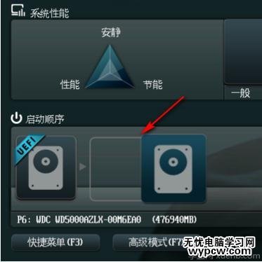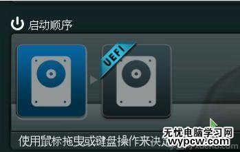 在最下方有“啟動順序”欄位,用鼠標(biāo)拖動可改變啟動選項,如:我們在使用U盤PE工具安裝系統(tǒng)時,可將UEFI調(diào)至第一位置。