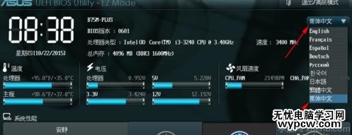 之后,我們可以看到BIOS的主界面,如果當(dāng)前顯示的是英文,可通過右上角的語言欄進(jìn)行設(shè)置。(注意,如需要保留畫面,可在電腦上插入U盤,按F12保留當(dāng)前頁面圖片)。