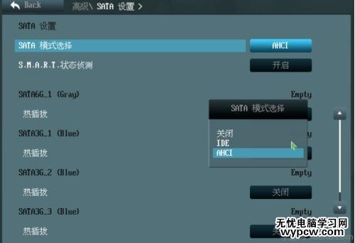 在高級選項的”SATA設(shè)置“中,可更改硬盤的模式。(一般更換系統(tǒng)時可用到,如XP一般使用IDE模式,Win7以上系統(tǒng)使用AHCI模式)。
