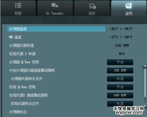 在”監(jiān)控“選項中,BIOS可以時時偵測主板的溫度、風(fēng)扇轉(zhuǎn)速、電腦等情況。