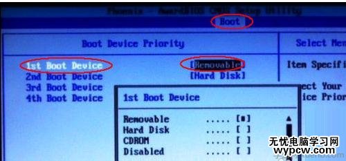 然后在“Boot Devicepriority”設置界面下選擇第一項“1st Boot Device”并按回車。然后在彈出的“1st Boot Device”選項中選擇第一項“Removable”(移動裝置):