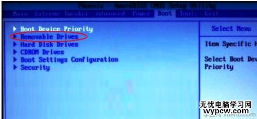 接下來按ESC取消鍵,返回上一級設置界面,按上下方向鍵,選擇第二行的“Removeable Drives”項,并按回車進入: