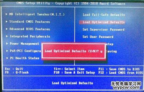 在 BIOS設(shè)置主菜單中選擇“Load Optimized Defaults”,并按“回車(chē)”鍵。當(dāng)出然“Load Optimized Defaults (Y/N)?”提示框后按“Y” -> “回車(chē)”鍵。如下圖