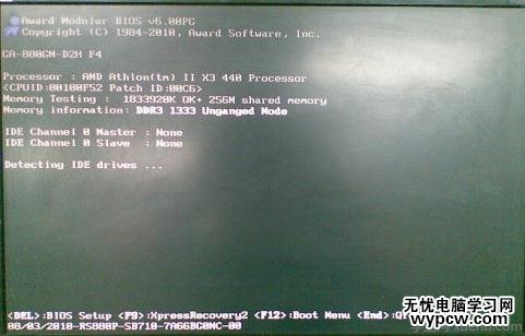 在開(kāi)機(jī)的第1個(gè)畫(huà)面(電腦自檢時(shí)),按“Del”鍵進(jìn)入“BIOS設(shè)置主菜單”。如下圖