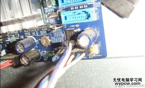我們找到“RESET”線和“POWER”線,撥上來,如圖。主板上也會標明。有些主板的寫法可能和這有些不同,不過也差不多。