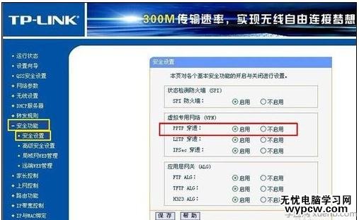 由于路由器型號眾多,在此只能舉例說明。對于TP-link路由器,切換到”安全功能“->“安全設置”選項卡,勾選“虛擬專用網絡”欄目中的“PPTP穿透”右側的“啟用”項。
