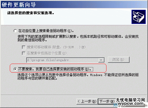 (4)隨后,選擇“不要搜索,我要自己選擇要安裝的驅動程序”。再點“下一步”按鈕(圖4)。