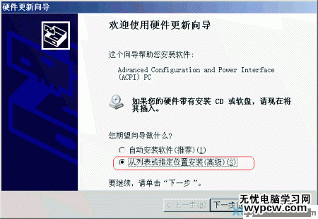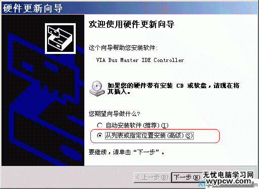 (3)進入“硬件更新向導”對話框后,選擇“從列表或指定位置安裝”,點“下一步”按鈕(圖3)。