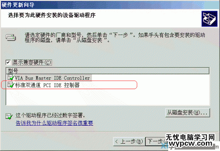 (5)在“顯示兼容設備”窗口中選成“標準雙通道PCI IDE控制器”,按照指示完成安裝(圖5)。