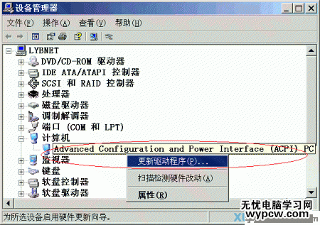 7、進入“控制面板”-->“系統”-->“設備管理器”,點擊“計算機”一項出現“ACPI Uniprocessor”子項目,或者“Advanced Configuration and Power Interface PC”(圖6)。
