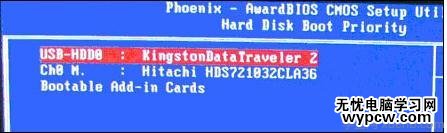 3、硬盤啟動優(yōu)先級(Hard Disk Boot Priority)選擇:使用小鍵盤上的加減號“+、-”來選擇與移動設(shè)備,將U盤選擇在最上面。然后,按ESC鍵退出,回到圖2的設(shè)置界面。