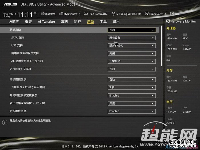 華碩Z97-Deluxe主板的BIOS主界面也是點綴以金色,默認啟動的還是EZ界面,可以按F7切換到高級模式做詳細設定。值得一提的是,華碩的BIOS選項切換做了類似手機那樣的動畫效果,頁面切換有那種左右平移的效果,操作起來非常流暢的感覺。