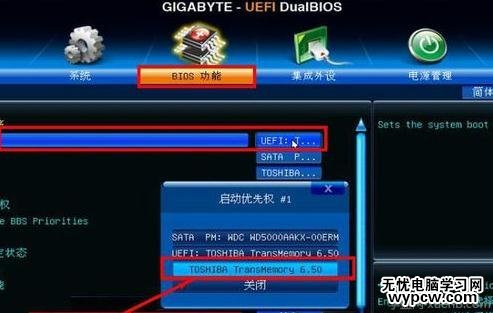 6,選擇最上面這一項“啟動優先權 #1”,然后按Enter鍵,會彈出一個窗口,在這里就可以看到U盤的名稱,這個是以TOSH...開頭,有的U盤是以king...開頭。