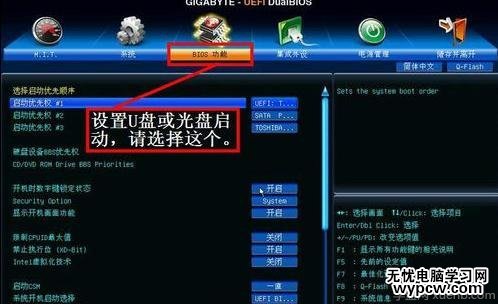 5,然后用左右方向鍵,移到"BIOS功能"這一項來, 我們要在這個選項下面進行U盤或光盤的啟動設置。
