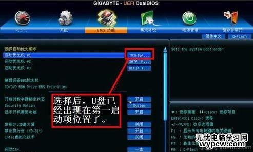7,當按了Enter確定鍵之后,退出小窗口,U盤就已經被選定成為了第一優先啟動的項。如圖: