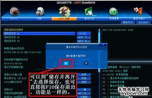 8,最后的工作就是要保存設置了,你可以到主界面的“儲存并離開”的選項下面去設置保存,還有一個更直接的方法是,直接按F10,就可以快捷地進行保存并退出,這兩項功能都是一樣的,在彈出的窗口中按“是”,這樣,UEFI設置從U盤或光盤的啟動方法就完成了。