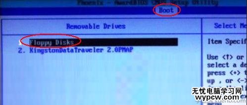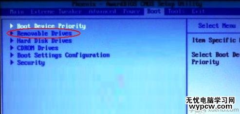 接下來按ESC取消鍵,返回上一級設置界面,按上下方向鍵,選擇第二行的“Removeable Drives”項,并按回車進入: