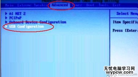 進入后按鍵盤上的右方向鍵找到“Advanced”選項,最下面項是“USB Configuration”,用上下方向鍵選擇它,回車進入: