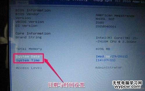 2,進入后,第一個界面是Main這一項。這一項的主要功能是顯示電腦的一些基本信息,除了時間外,沒有什么可設置的。