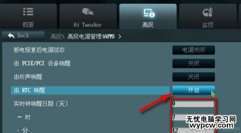 在高級選項中,可以點擊”高級電源管理(APM)“選項,設置電腦的定時開機功能。進入后,開啟由RTC喚醒(此項為南橋模塊喚醒,只要CMOS電池有電,且電腦電源接通的話,即可喚醒)。