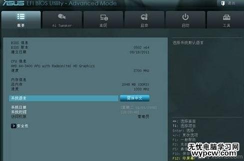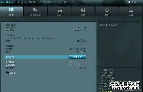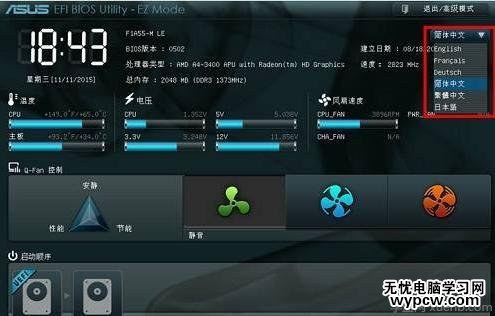 EFIBIOS的默認啟動EZ Mode(簡易界面)。最上方是包括時間日期以及基本配置的系統(tǒng)信息,下來是溫度、電壓以及風(fēng)扇轉(zhuǎn)速等相關(guān)信息,中間則是三個系統(tǒng)優(yōu)化選項提供了省電、一般和華碩最優(yōu)化,最下面是獨特的啟動順序調(diào)節(jié)區(qū)。用鼠標點擊右上角語言選擇下拉菜單,可選擇對應(yīng)的語言。