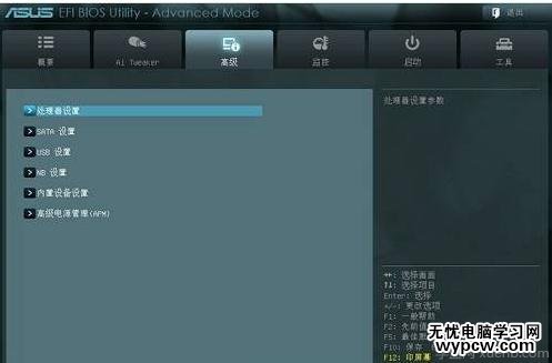 高級選項包括處理器設(shè)置、SATA硬盤接口設(shè)置、USB設(shè)置、NB設(shè)置、內(nèi)置設(shè)備設(shè)置、高級電源管理,如下圖。