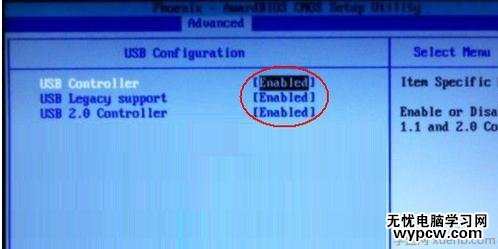 進入“USB Configuration”后,將所有項都改成“Enabled”,按上下方向鍵選中后按回車由“Disabled”改為“Enabled”即可: