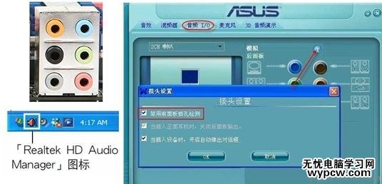 點擊鉗型按鈕后彈出“接頭設置”,這里有1到3個選項,主要的工作是在“禁用前面板插孔檢測”前打勾。其余的選項,按個人愛好自由勾選即可。切換到“音頻I/O”右邊的“麥克風”,可以設置麥克風錄音的一些效果(建議全部選取)點選回聲消除時會有個提示,確定即可。