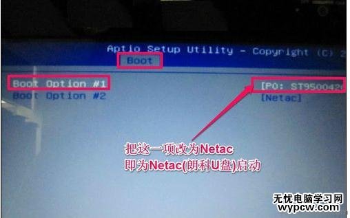 6,進(jìn)入后,會(huì)顯示硬盤(pán)啟動(dòng)項(xiàng),我的電腦有兩選項(xiàng),一個(gè)為:PO:ST9S.....這個(gè)是我的硬盤(pán),另一個(gè)為?a href=http://www.xuenb.com/web/aspx/ target=_blank class="infotextkey">.netac,這個(gè)是我的朗科U盤(pán)。注意,必須先把U盤(pán)插上才會(huì)顯示。如果要設(shè)置U盤(pán)啟動(dòng),在Boot Option #1這一項(xiàng)按Enter進(jìn)入,選擇Netac這第一啟動(dòng),然后按回車(chē),當(dāng)然最后一定要按F10進(jìn)行保存,這樣才會(huì)生效,自動(dòng)退出BIOS后,就會(huì)從U盤(pán)啟動(dòng)。