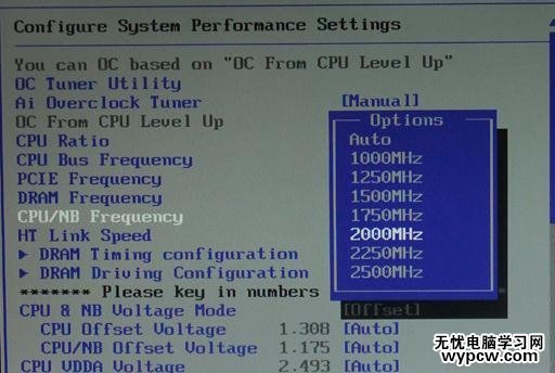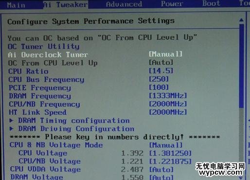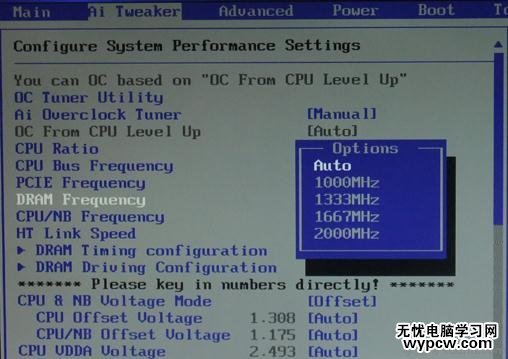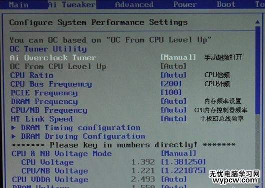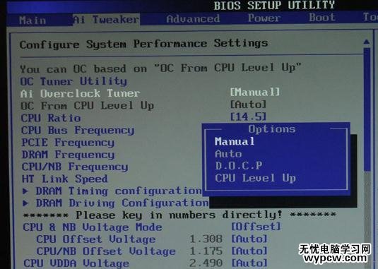 我們將光標選中Ai Overclock Tuner 敲擊鍵盤上Enter鍵,便會彈出一個框,里面有4個選項,默認為AUTO,我們將光標移至Manual手動檔點Enter確定,這樣我們就激活了主板手動超頻。