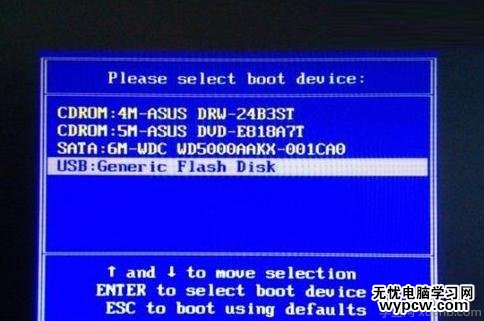 大家看下圖,將光標移動選擇到的地方顯示“USB:Gener ic Flash Disk”(小編寫這篇教程的時候使用的是u盤)所以,當我們按下快速熱鍵F8的時候顯示出來的選項中就包含有小編用u啟動制作好啟動盤的u盤。