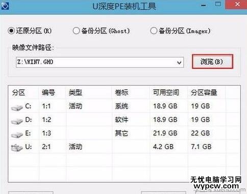 進(jìn)入win8pe系統(tǒng),將會(huì)自行彈出安裝工具,點(diǎn)擊“瀏覽”進(jìn)行選擇存到u盤中win7系統(tǒng)鏡像文件,將c盤作為系統(tǒng)盤,如下圖所示: