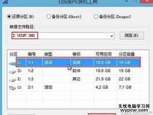 等待u深度pe裝機(jī)工具自動(dòng)加載win7系統(tǒng)鏡像包安裝文件,只需選擇安裝磁盤位置,然后點(diǎn)擊“確定”按鈕即可,如下圖所示: