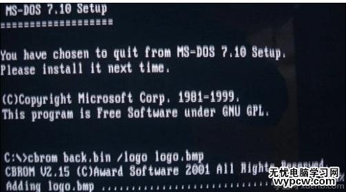 給備份的bios加入圖片(之前最好備份一下原版的bios)。運行命令 cbrom back.bin /logo logo.bmp(back.bin是被重命名777.bin,注意前后有空格。logo.bmp是要加入的圖像),出現(xiàn)下圖完成。完成后用cbrom back.bin /d 的命令可以看到在back.bin中的logo.bmp的文件。
