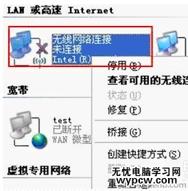 3.“開始”->“控制面板”->“網(wǎng)絡(luò)連接”,右鍵單擊“無線網(wǎng)絡(luò)連接”,選擇“查看可用的無線連接”。