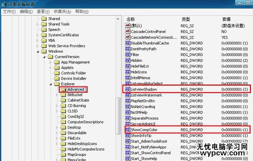 單擊,選中“Explorer”像下面的“Advanced”項。如下圖在右側欄中的找到“pstviewShadow”和“ShowCompColor”兩個鍵。