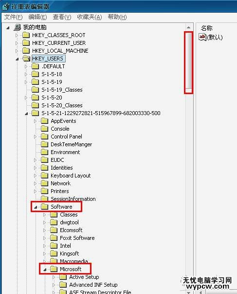 找到“software”雙擊展開,找到“Microsoft”項,雙擊展開。往下拉動右側的滾動條如下圖。