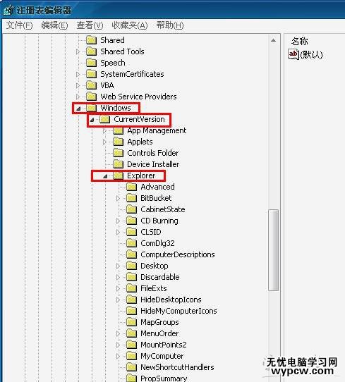 如下圖找到”windows“項下的“CurrentVersion”項,展開后找到“Explorer”同樣雙擊展開;