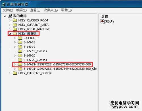 彈出注冊表窗口,如下圖找到HKEY_USERS項,雙擊展開,找到S-1-5-21-1229272821-515967899-68200330-500(此項不同的電腦可能鍵名不一樣)雙擊展開。